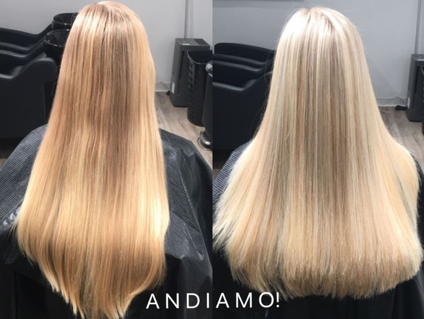 Reserved for clients who are already Platinum Blonde and need a bleach retouch for roots grown out 6 weeks or less. This includes a toning color gloss and a Signature Andiamo! Blowout.